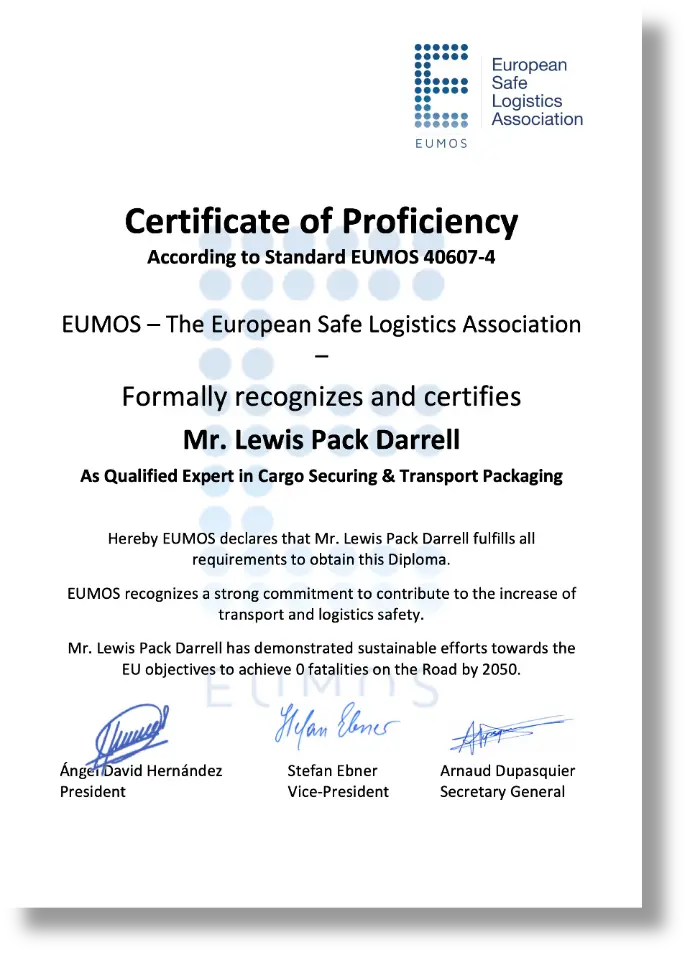 In the framework of the “EU Vision Zero” – 0 deaths on the road by 2050 – EUMOS has elaborated the standards EUMOS 40607 for 4 different professional groups aiming at qualifying experts for cargo securing and transport packaging to ensure safety on the roads. The qualification provides a threshold for professionals to perform their jobs according to Annex 3 of EU Directive 2014/47/EU which describes the EU provisions for cargo securing for technical road side inspections of the roadworthiness of commercial vehicles. The EUMOS standards specify the qualification criteria setting the minimum requirements to become a qualified expert in cargo securing and transport packaging. Eumos organises centralised exams for “Qualified Experts for Cargo Securing and Transport Packaging” to help professionals demonstrate their qualification.